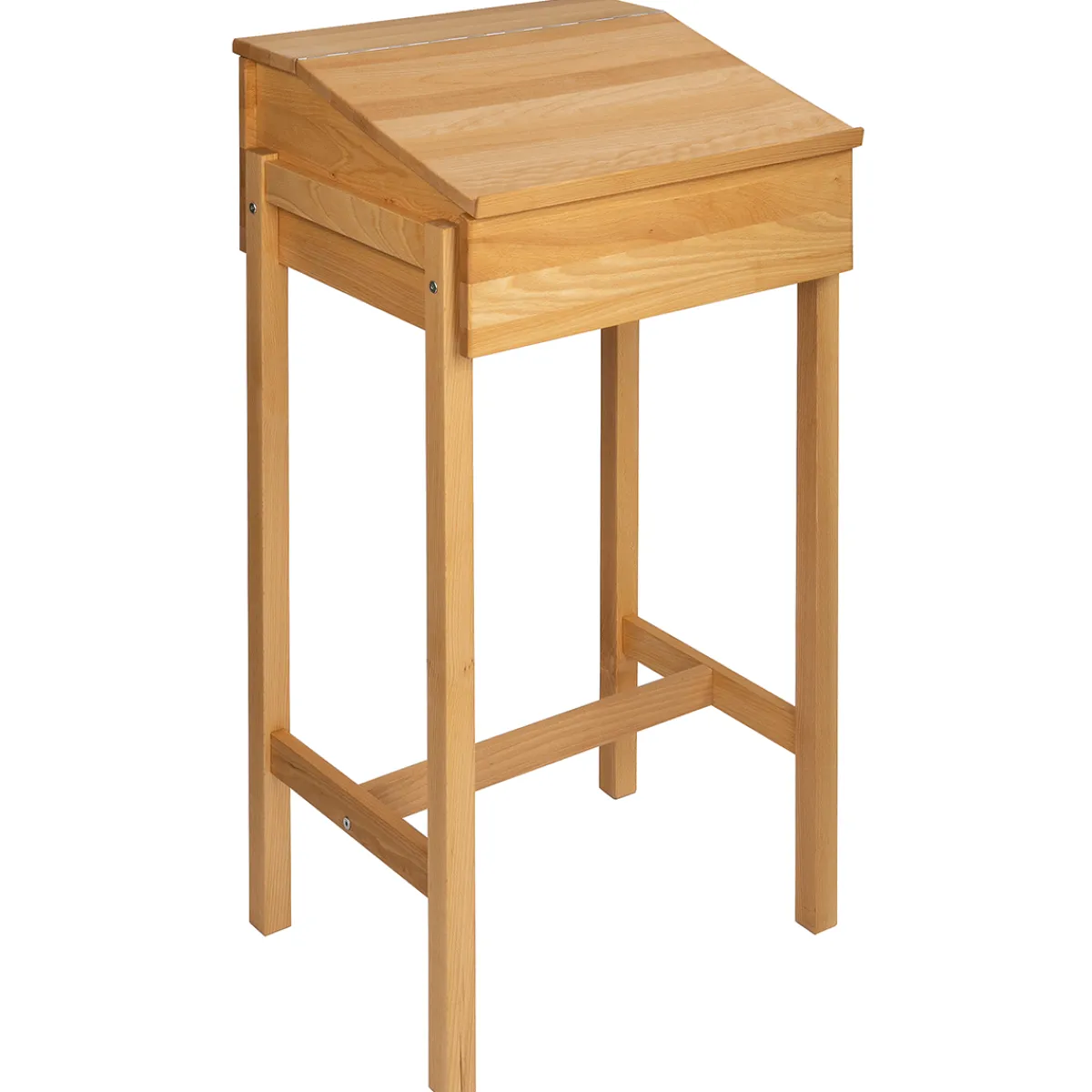 Schlicht, stabil und handgefertigt: Dieses Stehpult haben wir exklusiv für Sie von versierten polnischen Tischlern herstellen lassen. Der aus massivem Buchenholz gefertigte Arbeitstisch eignet sich auch bestens als exquisites Rednerpult. Sie können den Stehtisch in einem Büro, zu Hause im Wohnraum oder in einem Veranstaltungssaal platzieren. Lesen Sie daran, schreiben Sie oder halten Sie eine Ansprache – das Arbeiten im Stehen ist ohnehin eine gesunde Alternative zum vielen Sitzen. Früher haben Gelehrte, Wissenschaftler, Kulturschaffende und Forscher häufig an Stehtischen gearbeitet und ihre klugen Texte verfasst und redigiert. Das schlichte, fein geölte Holzpult kann sowohl an einer Wand, aber auch sehr gut mitten im Raum stehen. Dank der schmalen Holzleiste unten an der großen Schreibfläche (60 x 39 cm) bleiben Bücher und Dokumente an Ort und Stelle liegen. Oberhalb der schrägen Platte schließt sich eine flache Ablage (60 x 15,5 cm) an, auf der Sie Stifte, Schreibutensilien und ein Wasserglas abstellen können. Das Pult besteht aus einem Kasten mit Klappdeckel sowie zwei stabilen Beingestellen, die Sie lediglich mit den mitgelieferten sechs Schrauben und dem Sechskantschlüssel verbinden müssen. Unter dem Klappdeckel befindet sich ein 52 x 47 cm großes Fach, in dem Sie Papiere, Unterlagen, Schreibtischzubehör und anderes lagern können. Der Klappdeckel kann dank eines Scharniers offen stehen. Bei diesem Stehpult wurde eindeutig das Schöne mit dem Praktischen verbunden!