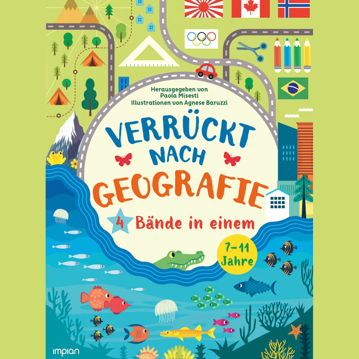 Dieser umfangreiche Sammelband vermittelt Geografiewissen mit Hilfe von Spielen und Aktivitäten. Das Konzept wurde von Experten für Didaktik entwickelt. Das spielerische Lernen wird ergänzt durch spannende Geschichten und bunte Illustrationen. Die Kinder werden in diesem Band mit den wichtigsten geografischen Konzepten vertraut gemacht und gleichzeitig spielerisch beschäftigt. Dieses Buch beinhaltet die vier Titel der Erfolgsreihe Verrückt nach Geografie: Flaggen, Karten, Landschaften, Städte. Hier erfährt man interessante Fakten und historische Informationen über die Welt der Fahnenkunde, Kartografie, Stadt- und Landschaftsplanung. Zugleich gibt es Spiele und Aktivitäten, die wissenschaftliche Zusammenhänge auf unterhaltsame Weise veranschaulichen. (Ab 7 Jahre)