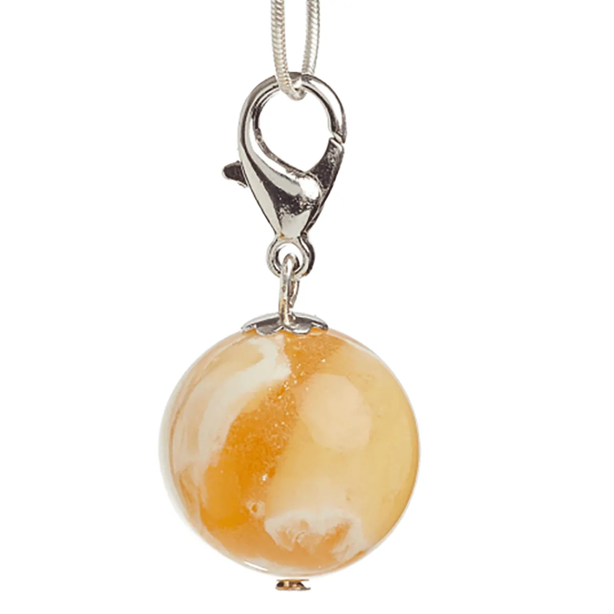 Edel wie Designerschmuck. Jede Kugel ist einzigartig. Mit dem ungewöhnlichen Zusammenspiel von Weiß und Gelb handelt es sich tatsächlich um Weihrauch, nicht um Bernstein. Der weiche Schliff und der feine Glanz lassen den Weihrauch wie goldenes Licht leuchten. Dieser Lichtschimmer durchzieht die Aura – sie leuchtet golden. Karabiner Metalllegierung, Kugel Ø ca. 1,8 cm.