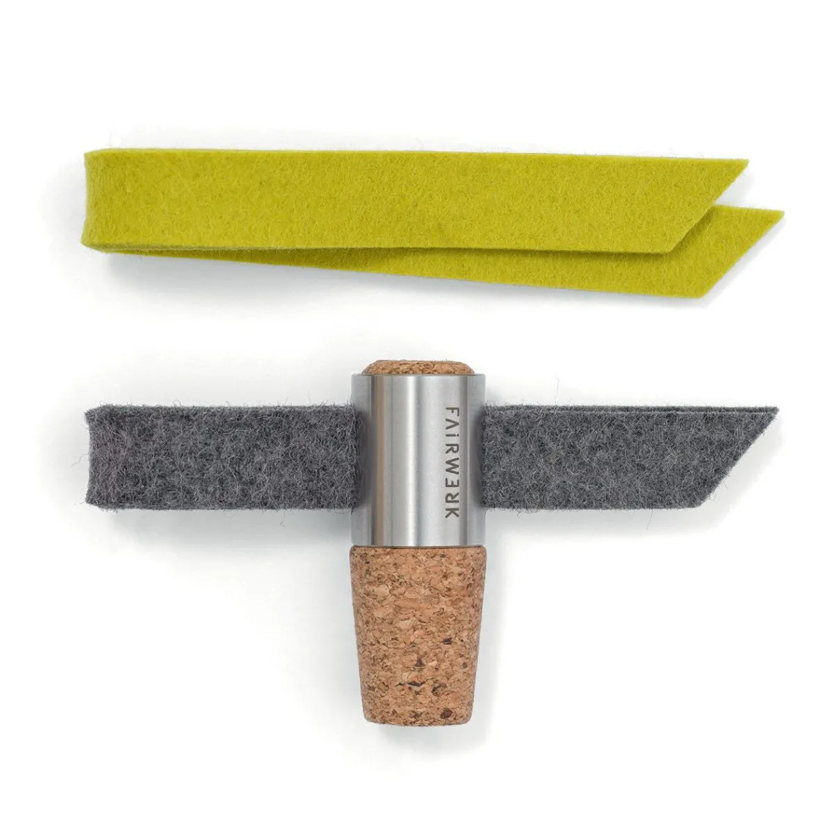 5 x 10 cm, 1 Korken, 2 x Filz in grau und limone, Edelstahl.