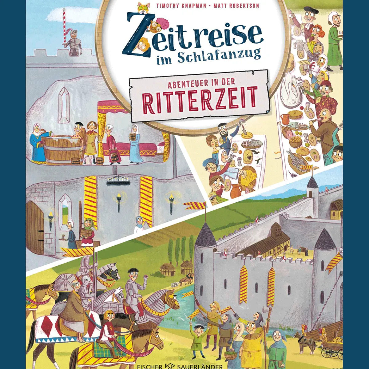 Ein Kindersachbuch über die Ritter – im Comicstil erzählte und erlebbare Geschichte für Kinder ab 5 Stell dir vor, du würdest einen Zeitreisetanz machen und auf einmal in der Ritterzeit landen. Wie verrückt wäre das? Aber genau das passiert Jakob, Lula und der Katze Kralli in diesem Kindersachbuch für das Grundschulalter. Zum Glück knüpfen die drei schnell mittelalterliche Freundschaften und werden von ihren neuen Freunden in die Geheimnisse der Ritterzeit und des Lebens auf der Burg eingeführt. Es erwarten sie ganz schön kratzige Gewänder und jede Menge harter Arbeit, zum Beispiel bei der Ausbildung zum Ritter oder auf dem Feld. Ein umso größeres Highlight sind das spannende Ritterturnier und das üppige Festmahl mit lustiger Narren-Unterhaltung. Am Ende ihres Abenteuers freuen sich die Kinder schon wieder auf das entspannte Leben zuhause, aber die praktischen Beinschoner der Ritterrüstung würden sie gerne mitnehmen.Zurück im kuscheligen Bett haben die kleinen Leser in bunten und detailreichen Bildern sehr viel erlebt und mit großem Spaß jede Menge über das Mittelalter gelernt.Besonderes Konzept: Sachwissensvermittlung in DialogformViel Humor und gute Unterhaltung – so macht Geschichte SpaßAufwendige Wimmelbilder und extra große AusklappseiteWeitere Titel in der Reihe ‚Zeitreise im Schlafanzug‘ Essen, wohnen, spielen – Erlebe das alte Ägypten