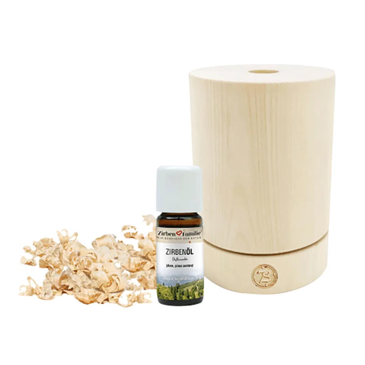 Ø 7 cm, 10 cm, 10 ml Zirbenöl, ca. 3 g Zirbenflocken.